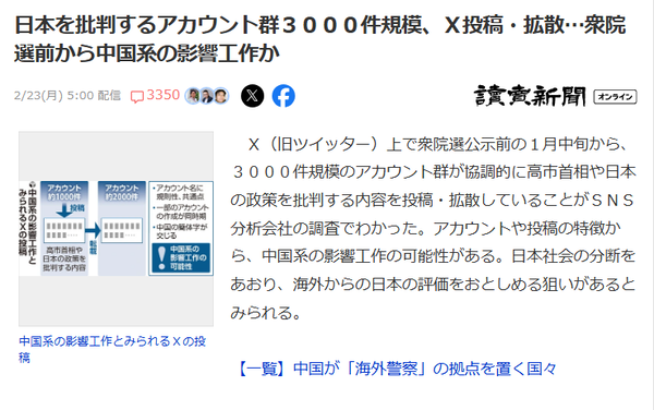 日本を批判するアカウント群3000件規模 X投稿中国系工作か