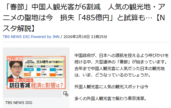 「春節」中国人観光客が6割減 人気の観光地・アニメの聖地は今 損失「485億円」