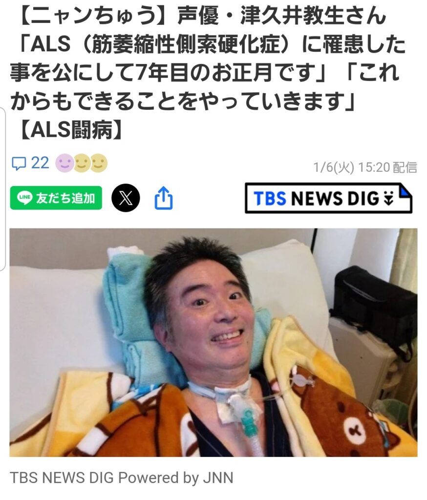 ニャンちゅう声優「ALSになって7年目のお正月です、3年目に危篤状態になってから4年目です、訪問入浴の丸洗いが気持ちいいです」