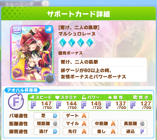 【ウマ娘】マルシュロレーヌのアオハル適性 芝D!