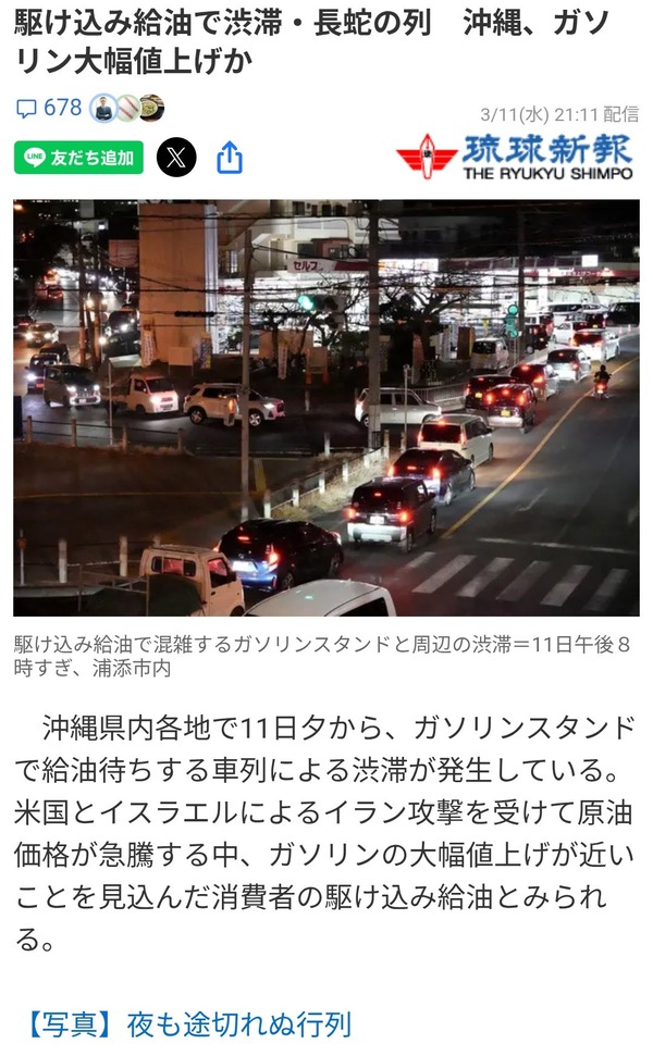 ガソリン26円値上げします → 日本人「ぎゃーガソリン入れなきゃ」各地で渋滞
