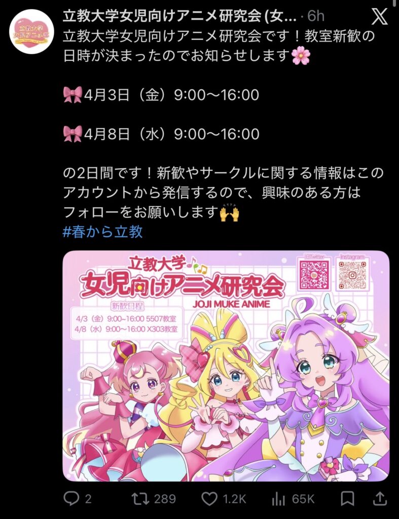 【画像】立教大学、「女児アニメ」研究会の新歓開始wwwwwwwwwwwww