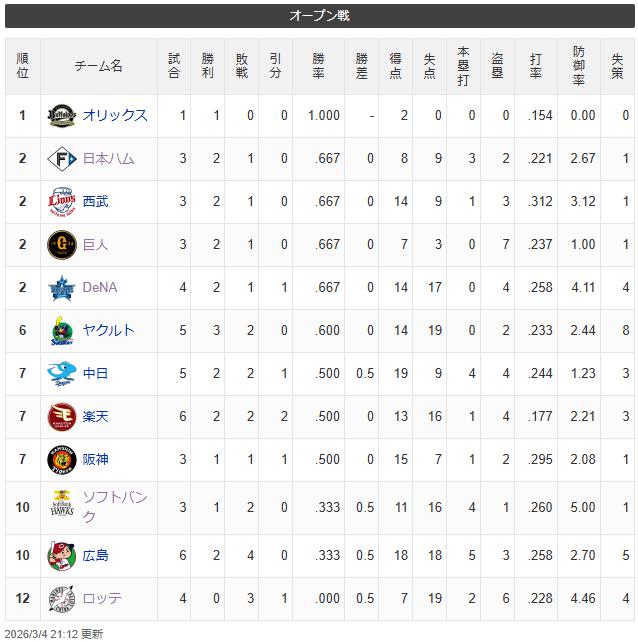 オープン戦順位表(2026.3.5)