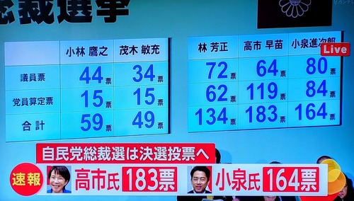 【速報】総裁選、決選投票は小泉進次郎vs高市早苗