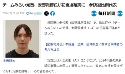 【速報】TBS自民が歴史的大敗、参政党11席突破「山尾志桜里氏が落選確実、 NHK党・浜田聡も本人落選投稿、二階俊博氏の三男も落選」北村弁護士は当確