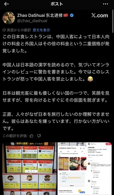 【悲報】ラーメン屋「中国人トラブル多いし出禁にするぞ」X民「お前の店二重価格やんけ」←なぜか大炎上wwwww