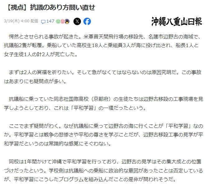 徳島新聞社説 辺野古の転覆事故による平和学習後退を懸念する [3/21]