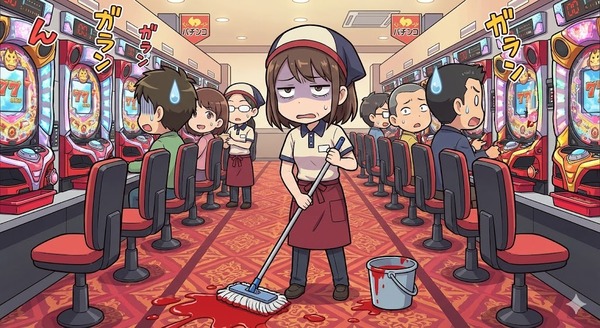 【恐怖】パチンコ客が吐血してできた血溜まりを掃除したホールスタッフさん、高熱が出てしまう…